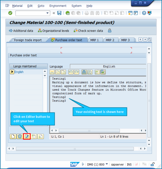 *: Indicator used for the start line of a long text paragraph; in this case, it is an asterisk (*). The asterisk (*) tag column value refers to Default Paragraph in SAP.=: Indicator used to continue the line; typically, it should be equal sign (=). This Indicator is used when the paragraph text should be displayed in continuous format. The equal sign tag column value refers to Extended Line in SAP./: Indicator used for new line in long text paragraph. If the long text consists of multiple paragraphs, then each paragraph is started with a slash/.1: Indicator used to decide whether the given text should be inserted before the existing long text. You must maintain1as the fourth indicator in the Process file.