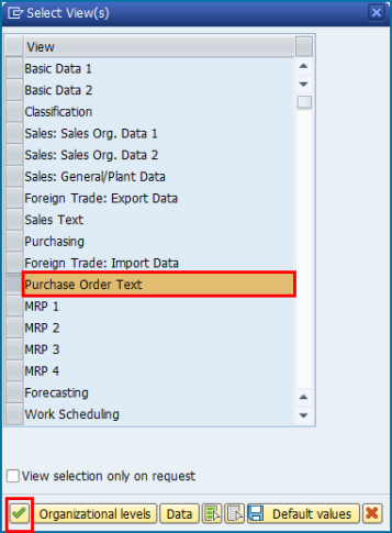 MM02. - In the SAP GUI, enter the material number and press Enter. The Select View(s) window is displayed.
