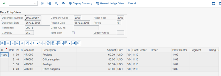Let us consider an FB50 transaction (with Company Code). For information about how to record an FB50 transaction (with Company Code), see.FB50 - Create Multi-Line GL Document .