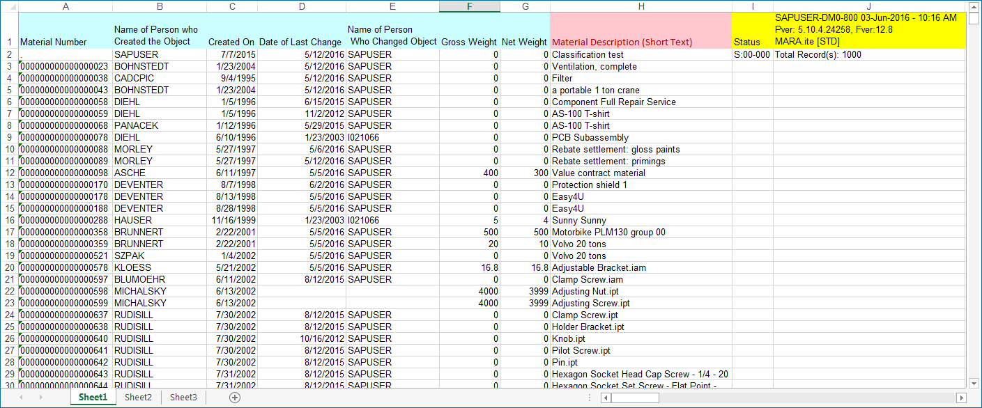Columns A to G contains data from MARA (header) table, such as Material Number, Created On, Material Type, Material Group, Gross Weight, Net Weight, and Base Unit of Measure.