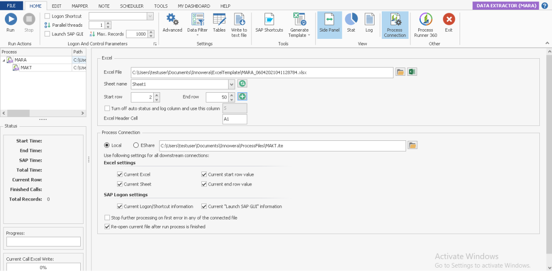 Process Connection, and browse to find the MAKT Process file. - Ensure that the status and log columns from your first Process file is not overwritten by the data extraction of the second Process file. Also, update the End Row value to get the complete extraction from the second table.