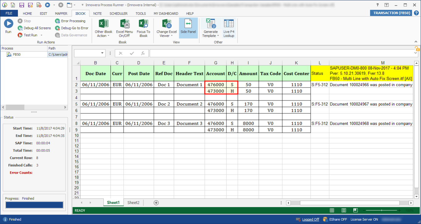 F, you can use this block type and when there is new document number, Process Runner starts a new Header-Detail transaction automatically. - On Change Ignore Blanks: Is the same as the On Change option, but instead of repeating the document number, you have blanks between the document numbers. Because a blank is a change, you want to tell Process Runner to ignore blank for considering them as a change. Process Runner ignores the blank and repeats the new Header-Detail transaction when it encounters new document number in column