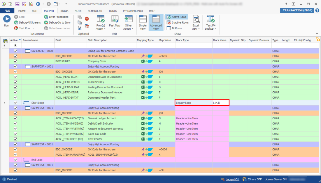 Note: The two fields to map for Header-Detail looping are Block Type and Block Value. These fields are to tell Process Runner how data in Excel file is arranged. Also, you must update the Block Type and Block Value in the same row as the Start Loop.