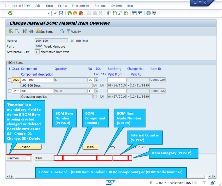 This topic describes how to use the SAP transaction CS02 (Change Material BOM) for BOM management to change the BOM items of materials that are already created. Use Function field for selecting the item numbers to record the BOM item changes correctly (Add, Edit and Delete) in a CS02 transaction while recording to ensure that no existing components are overwritten.