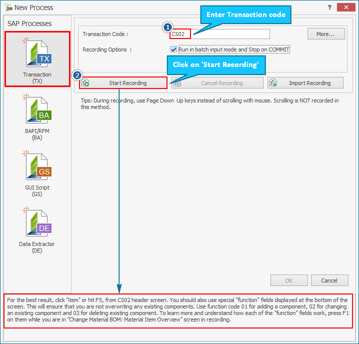 Functionfield displayed in the lower-left of the window. This ensures that the Process file being recorded works for Add, Edit, and Delete BOM items. IfPositionfield is used while recording, it is possible that this may not work for addition of BOM items using the same Process file. Therefore, we recommend that you do not usePositionfield. - Enter the values in the Change material BOM: Material Item Overview window according to your requirements and complete the recording.