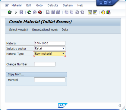Let us consider an example of creating new material master in SAP using the SAP transaction code MM01. MM01 is a standard SAP transaction code available with an R/3 SAP systems depending on the version and release level. Sector, Type and Material Number are required to create a material; you can optionally add other details to the material using the Basic View and save the material data.