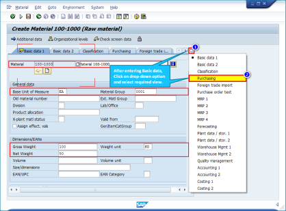 - Enter the required information when you are in Basic data 1 view (or first view you selected). Select Purchasing view from the pull-down menu on the right side.