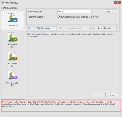 In the New Process window, Process Runner provides a tip about recording in different views.