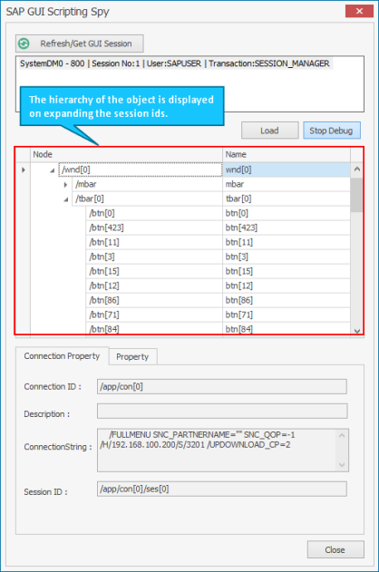 This topic describes how to configure the Scripting Spy option for debugging and duplication. Each SAP screen has its own screen ID that you can view using scripting spy. This option also allows you to select and view properties of an UI element by directly clicking it. It displays the complete hierarchy of the object that you select.