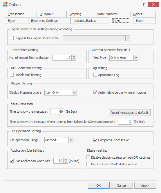 - On the Other tab, select Suggest this Logon Shortcut file and then select a logon shortcut file from the dropdown list. The selected logon shortcut file is displayed during the recording of a transaction, which eliminates the SAP logon step and speeds up your recording process.