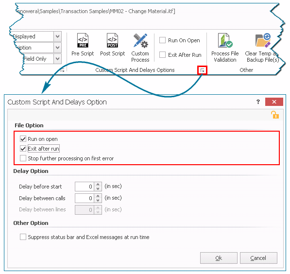 - . Open the Process file for which you want to configure the start and delay options and click the pop-up icon. The Custom Scripts and Delays Option window is displayed.
